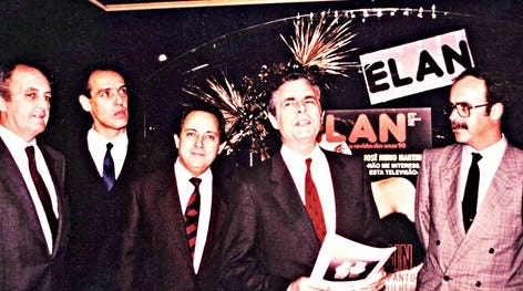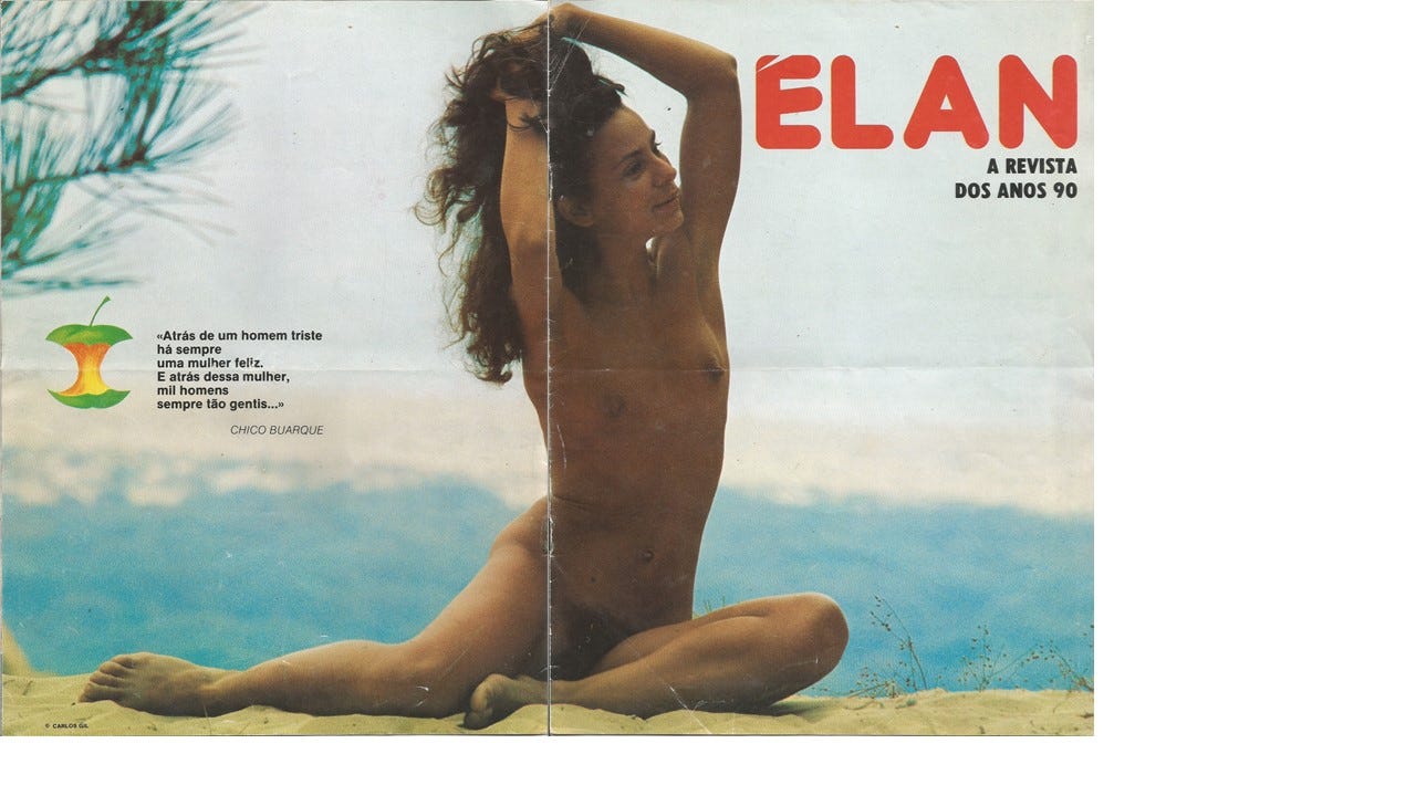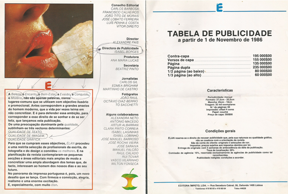 ‘Estarão na andropausa?’ Foi o que pensei quando o João Tito de Morais, Xis Calheiros, Luis Penha e Costa e Carlos Barbosa vieram falar-me no projecto da revista Élan. O João: ‘Borges precisamos de ti para a publicidade!’. Euzinha?!? ‘Tem de ser uma mulher. Um homem, ia-se perder nos detalhes e no meio de tantas meninas. Mulher? Aí pensámos: a Borges ia achar graça!’. Na CEIG no Dafundo eram impressos os jornais Expresso, Correio da Manhã, A República, etc. e funcionavam as redações do Blitz e do AutoSport.